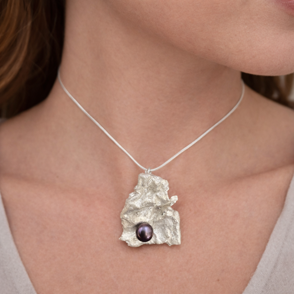 This wonderful, organic, fine silver pendant was created using a base of dried saguaro skin. Set with an 8mm dark gray freshwater pearl, it is a show stopper and will elicit many compliments.