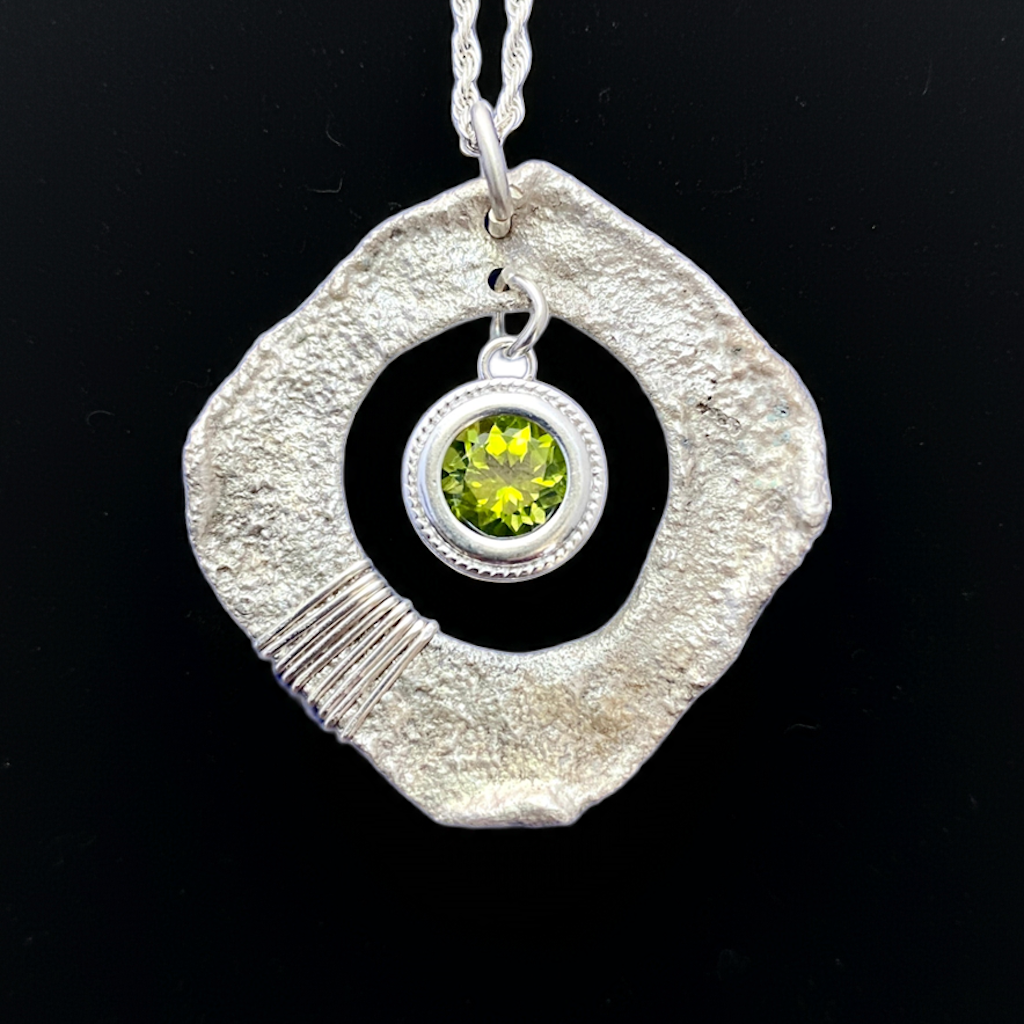 Clear and calming green, this unique handmade jewelry is grounding and meditative. Perfect for the yoga instructor on-the-go or the down-to-earth executive, this sterling silver jewelry easily becomes a wardrobe staple. Recognized as the August and Leo birthstone, this pendant is a perfect birthday gift.