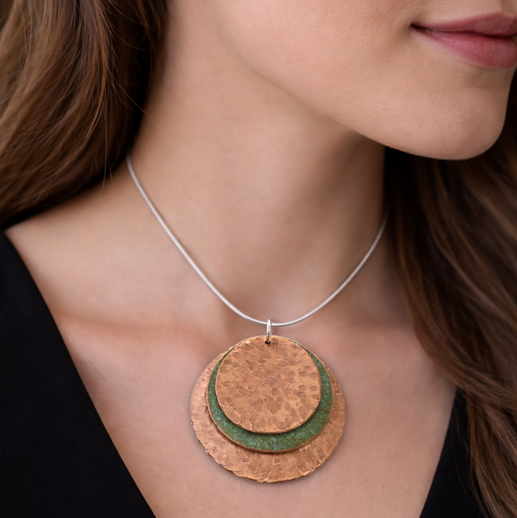 Unique pendants are one of my specialties, and this patina and copper 3-disc pendant takes individuality to the next level. With no two pendants the same, this patina jewelry allows you to embrace your appreciation of the unknown while marveling at the beautiful results of random chance. And your friends will marvel at you!