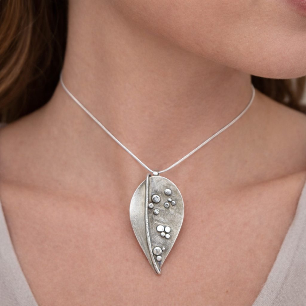 A beautiful leaf-inspired Sterling Silver pendant, embellished with fused Raindrops and Sterling wire. A fun piece of nature for your neck.
