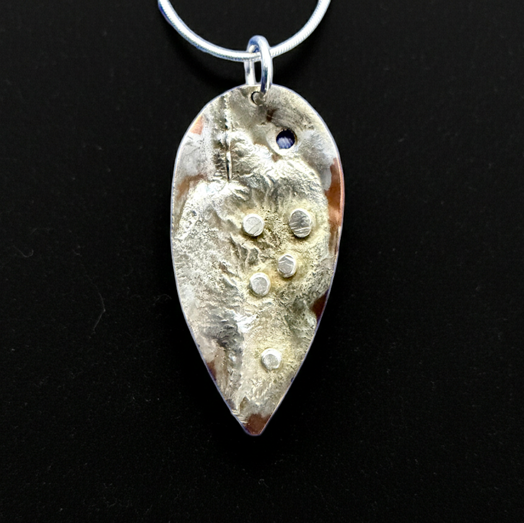 - 1.875"x.75" sterling silver reticulated over copper leaf