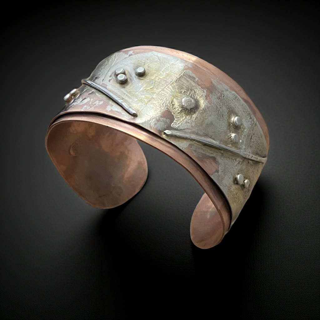 A new look in my copper and silver reticulated cuffs - the copper overlay with reticulated silver is accented with fused sterling raindrops and wire. A simple yet elegant design that looks just as beautiful with jeans as it does for dressier occasions.