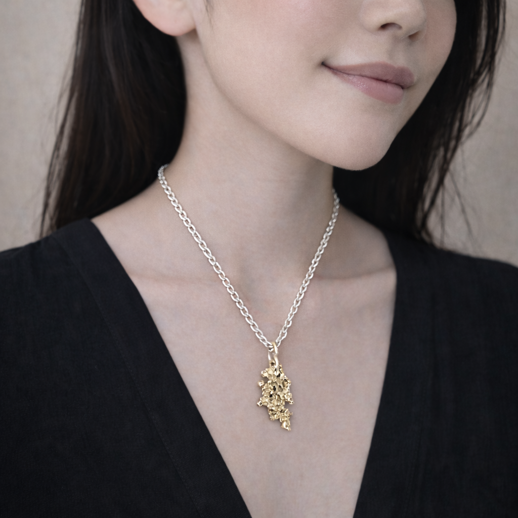 This unique freeform, salt-cast pendant features a 1.5"x.75" sterling silver design, complemented by a sterling chain.