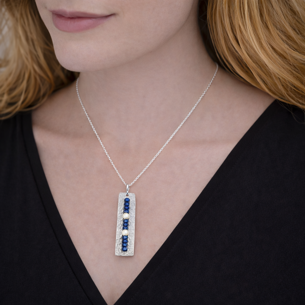 This lapis and pearl jewelry is a one-of-a-kind approach for you! Combining the hammered silver with the splash of lapis lazuli, and tiny white pearls for contrast, this is artisan jewelry at its most inspired — a meeting of the traditional and the personal.